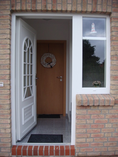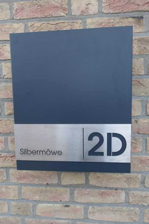 Schon von außen her fällt der Eingang zur Ferienwohnung Silbermöwe, Tunnelstr. 2d, ins Auge. Dafür sorgen die beiden Möwen an der Hauswand.